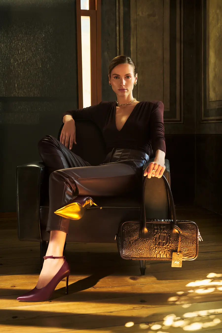Parti sezonunun yıldızları; gold ve gümüş tonlarla bezenmiş stilettolar, ayna etkili çantalar ve zarif bilekten bağlı modeller oluyor. Güçlü duruşu tamamlayan sivri burun formlar ve yüksek topuklar, şehirli kadının zamansız zarafetini yeniden yorumluyor.