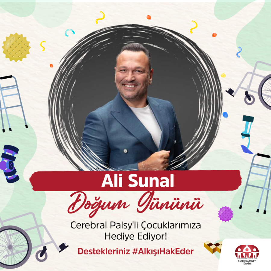 Güldür Güldür Show’un sevilen sunucusu Ali Sunal, 22 Eylül’deki doğum gününü Türkiye Spastik Çocuklar Vakfı – Cerebral Palsy Türkiye’ye hediye ediyor. Sunal, sosyal medya hesabından Cerebral Palsy’li çocuklar için başlattığı destek çağrısıyla takipçilerine seslenerek “Bu yıl 22 Eylül’de yeni yaşıma girerken gelin hep birlikte Cerebral Palsy’li çocuklarımıza destek olalım. Doğum günümde dileklerim hayallere dokunsun, siz debu hayallere ortak olun. Cerebral Palsy’li çocuklarımızın önündeki engelleri iyiliği paylaşarak kaldıralım. Detaylı bilgi için @cerebralpalsytr sayfasını ve bio’mdaki linki ziyaret edebilirsiniz”dedi.