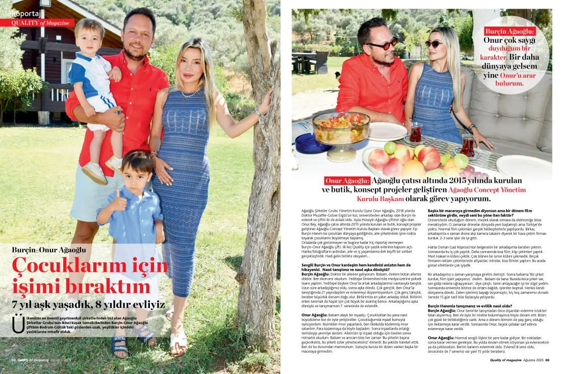 Ağaoğlu Şirketler Grubu Yönetim Kurulu Üyesi Onur Ağaoğlu, 2018 yılında Doktor Muzaffer-Gülser Ergöz’ün kızı, üniversiteden arkadaşı olan Burçin ile evlendi ve Çiftin iki de evladı oldu. Ayla-Hüseyin Ağaoğlu çiftinin oğlu olan Onur Bey, Ağaoğlu çatısı altında 2015 yılında kurulan ve butik, konspt projeler geliştiren Ağaoğlu Concept Yönetim Kurulu Başkanı olarak görev yapıyor. Eşi Burçin Hanım ise çocukları dünyaya geldiğinde, aile şirketindeki işine nokta koyarak çocuklarını büyütmeye başlamış. Ortalarda çok görünmeyen ve bugüne kadar hiç röportaj vermeyen Burçin-Onur Ağaoğlu çifti, ilk kez Quality için yazlık evlerinin kapısını açtı, Harika fotoğrafların ardından, aile ve iş yaşamlarına dek keyifli bir sohbet gerçekleştirdik. Hadi gelin birlikte okuyalım.
