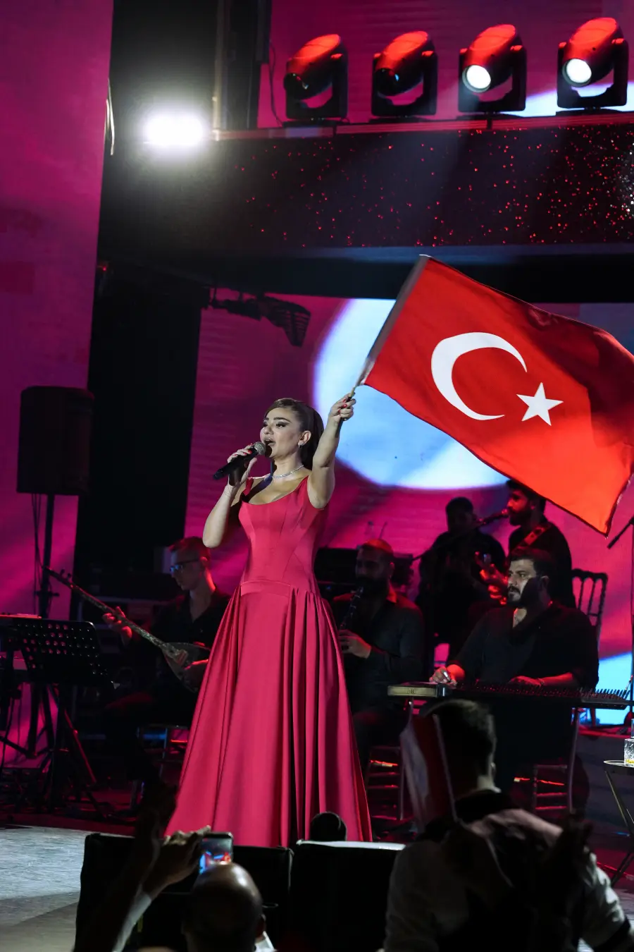 Bayrak sallayarak izleyicilere coşkulu anlar yaşatan sanatçı, sahneyi Cumhuriyet ruhuyla aydınlattı.