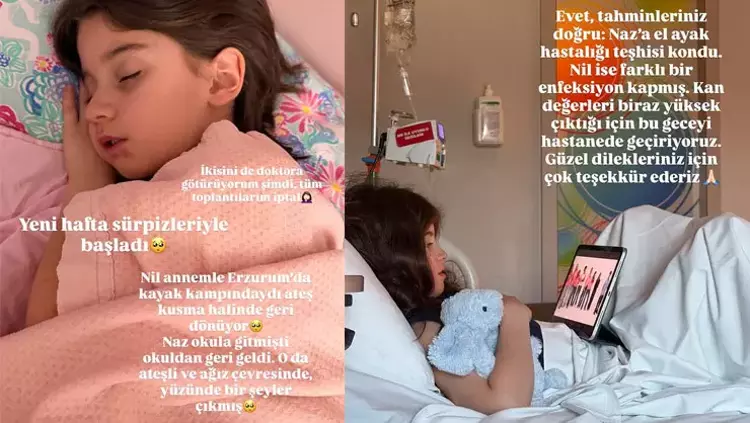 Geceyi hastanede geçirdiklerini söyleyen Terim, son durumlarını anlattı. Hastane odasından paylaşım yapan Terim, “Evet, tahminleriniz doğru. Naz’a el ayak hastalığı teşhisi kondu. Nil ise farklı bir enfeksiyon kapmış. Kan değerleri biraz yüksek çıktığı için geceyi hastanede geçiriyoruz. Güzel dilekleriniz için teşekkür ederiz” ifadelerini kullandı.