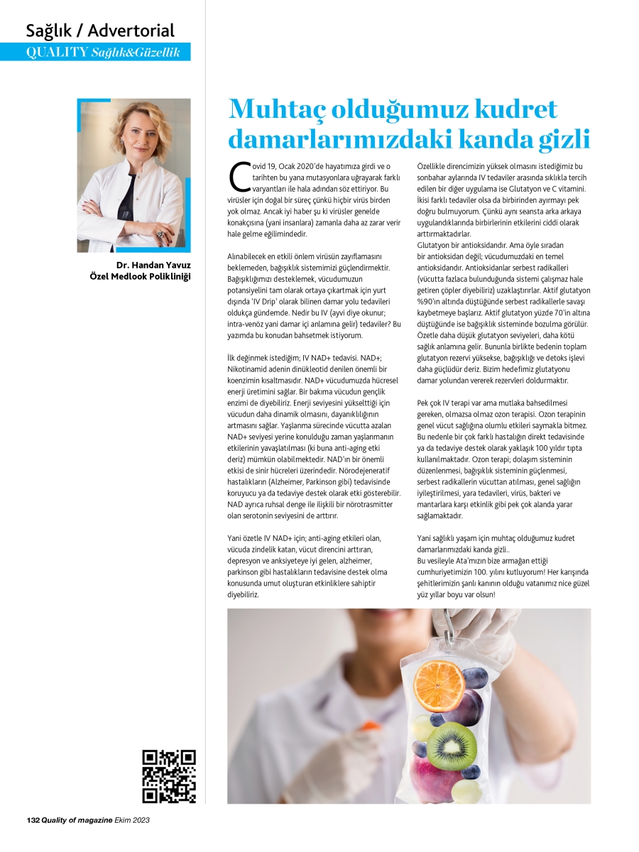 İlk değinmek istediğim; IV NAD+ tedavisi. NAD+; Nikotinamid adenin dinükleotid denilen önemli bir koenzimin kısaltmasıdır. NAD+ vücudumuzda hücresel enerji üretimini sağlar. Bir bakıma vücudun gençlik enzimi de diyebiliriz. Enerji seviyesini yükselttiği için vücudun daha dinamik olmasını, dayanıklılığının artmasını sağlar. Yaşlanma sürecinde vücutta azalan NAD+ seviyesi yerine konulduğu zaman yaşlanmanın etkilerinin yavaşlatılması (ki buna anti-aging etki deriz) mümkün olabilmektedir. NAD’ın bir önemli etkisi de sinir hücreleri üzerindedir. Nörodejeneratif hastalıkların (Alzheimer, Parkinson gibi) tedavisinde koruyucu ya da tedaviye destek olarak etki gösterebilir. NAD ayrıca ruhsal denge ile ilişkili bir nörotrasmitter olan serotonin seviyesini de arttırır.