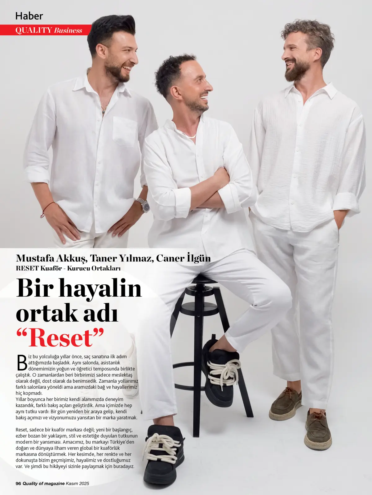 Reset, sadece bir kuaför markası değil; yeni bir başlangıç, ezber bozan bir yaklaşım, stil ve estetiğe duyulan tutkunun modern bir yansıması. Amacımız, bu markayı Türkiye’den doğan ve dünyaya ilham veren global bir kuaförlük markasına dönüştürmek. Her kesimde, her renkte ve her dokunuşta bizim geçmişimiz, hayalimiz ve dostluğumuz var. Ve şimdi bu hikâyeyi sizinle paylaşmak için buradayız.