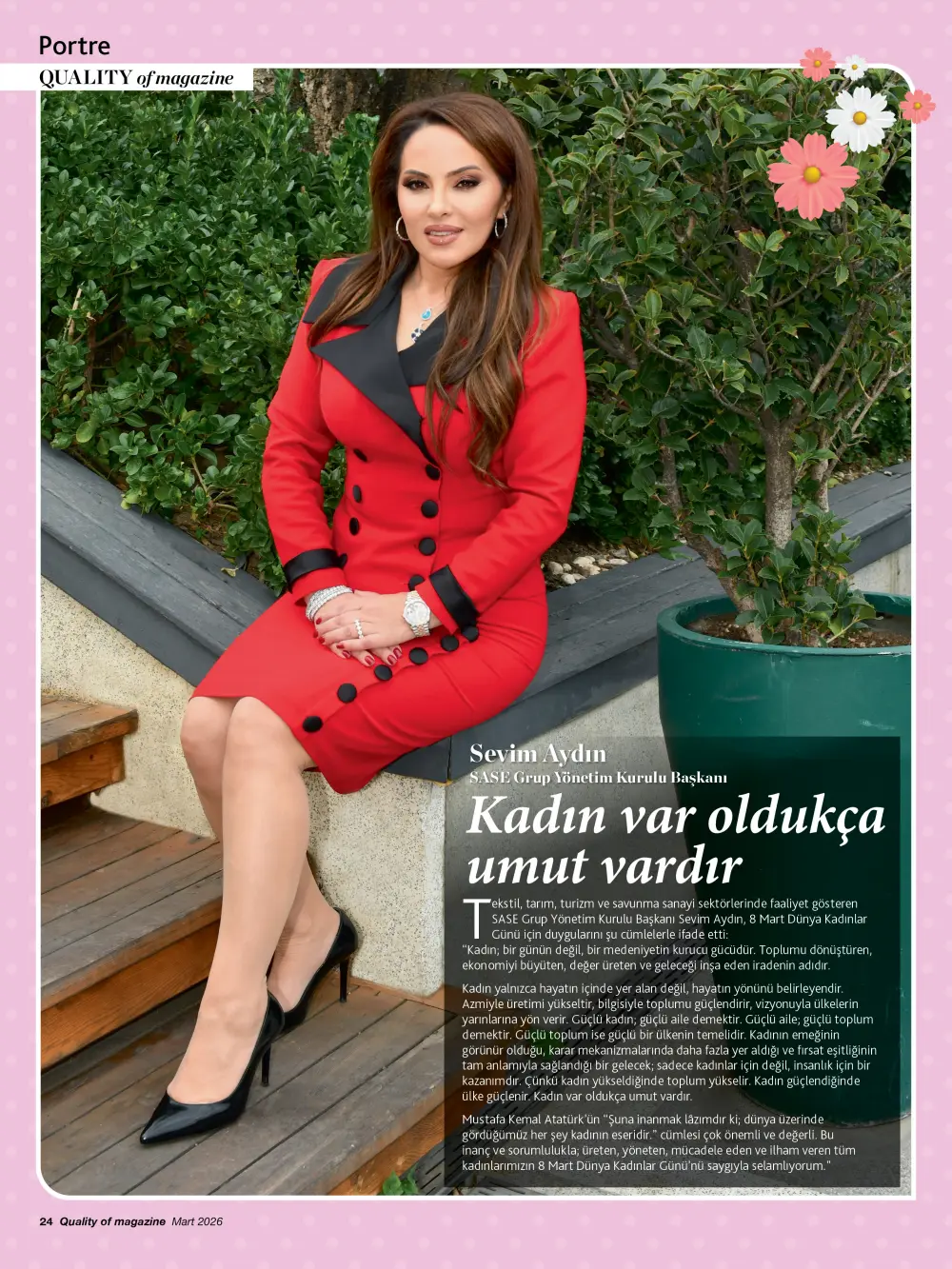 Tekstil, tarım, turizm ve savunma sanayi sektörlerinde faaliyet gösteren SASE Grup Yönetim Kurulu Başkanı Sevim Aydın, 8 Mart Dünya Kadınlar Günü için duygularını şu cümlelerle ifade etti. “Kadın; bir günün değil, bir medeniyetin kurucu gücüdür. Toplumu dönüştüren, ekonomiyi büyüten, değer üreten ve geleceği inşa eden iradenin adıdır.