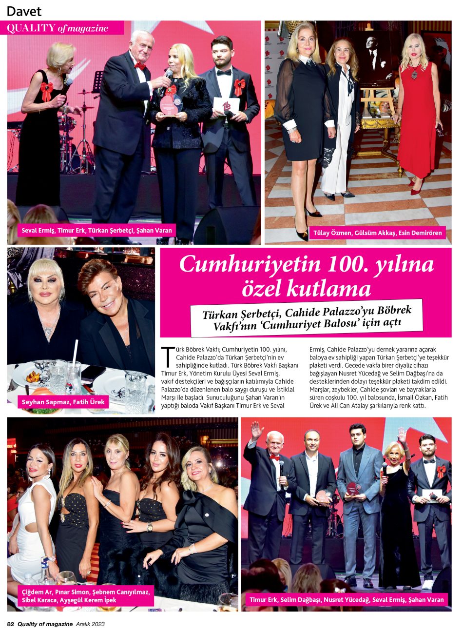 Gecede vakfa birer diyaliz cihazı bağışlayan Nusret Yücedağ ve Selim Dağbaşı’na da desteklerinden dolayı teşekkür plaketi takdim edildi. Marşlar, zeybekler, Cahide Şovları ve bayraklarla coşkulu 100 yıl balosunda, İsmail Özkan, Fatih Ürek ve Ali Can Atalay şarkılarıyla renk kattı…