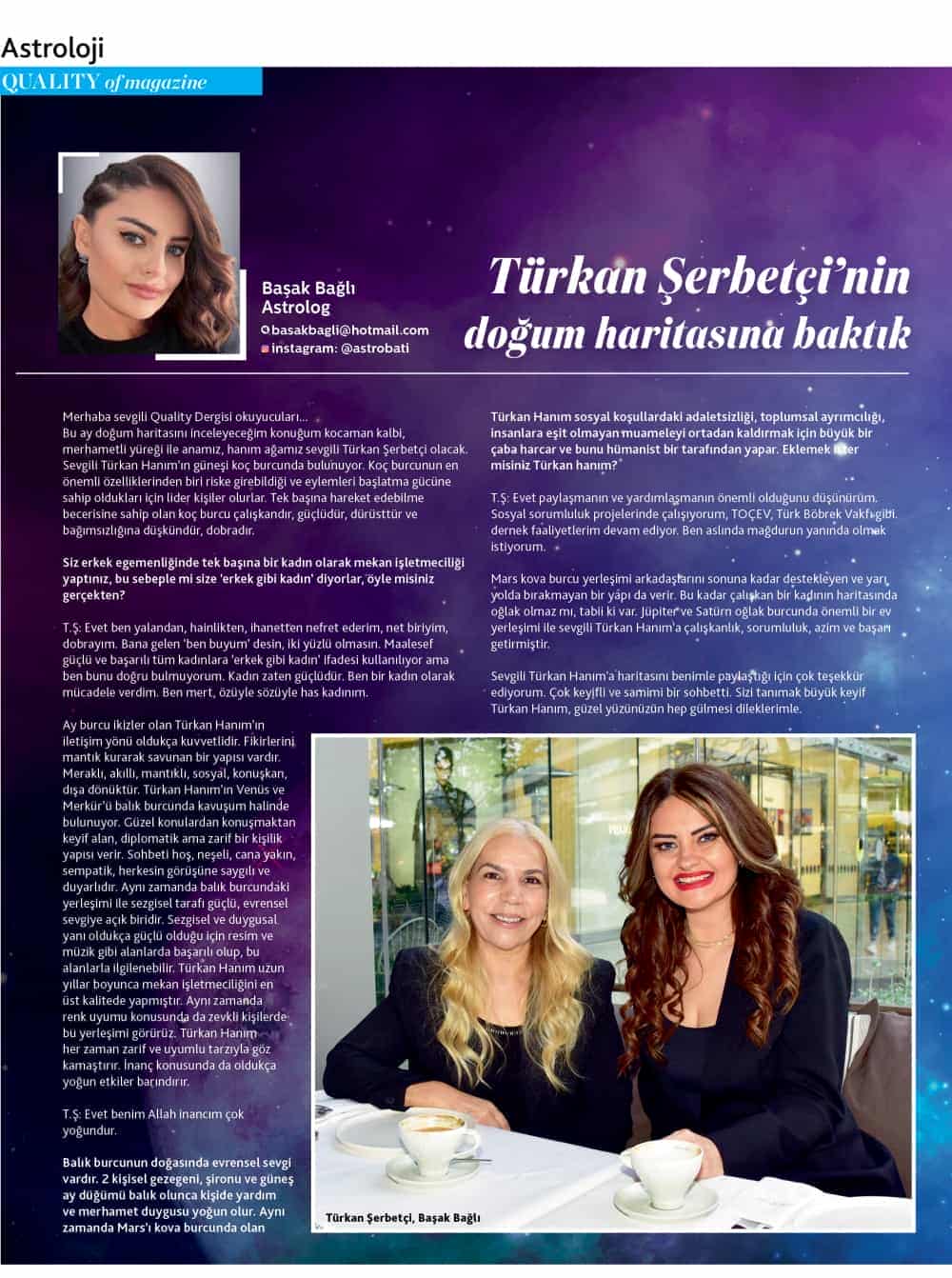 Bu ay doğum haritasını inceleyeceğim konuğum kocaman kalbi, merhametli yüreği ile anamız, hanım ağamız sevgili Türkan Şerbetçi olacak.
