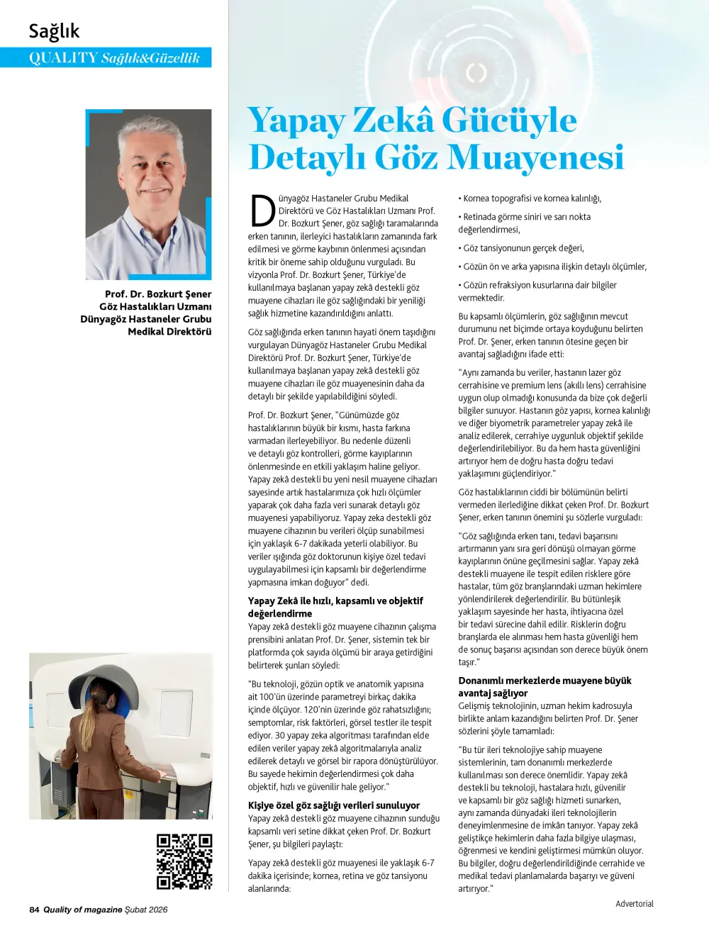 Dünyagöz Hastaneler Grubu Medikal Direktörü ve Göz Hastalıkları Uzmanı Prof. Dr. Bozkurt Şener, göz sağlığı taramalarında erken tanının, ilerleyici hastalıkların zamanında fark edilmesi ve görme kaybının önlenmesi açısından kritik bir öneme sahip olduğunu vurguladı. Bu vizyonla Prof. Dr. Bozkurt Şener, Türkiye’de kullanılmaya başlanan yapay zekâ destekli göz muayene cihazları ile göz sağlığındaki bir yeniliği sağlık hizmetine kazandırıldığını anlattı.