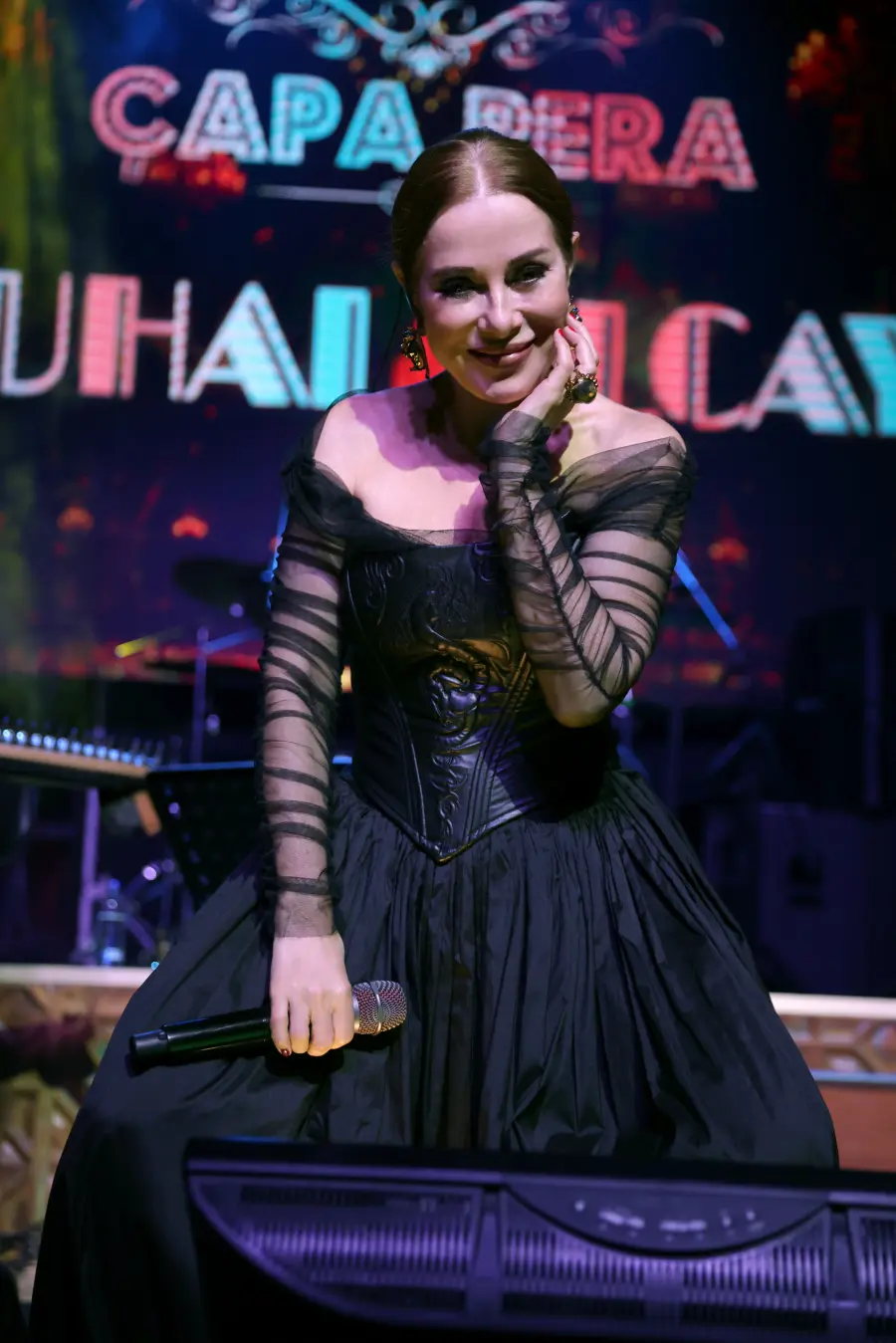 Çapa Pera konserinde 2 ayrı kostüm tercih eden Zuhal Olcay, şıklığının yanı sıra topuz yaptığı zarif saçları ve zarifliğiyle de dikkat çekti.